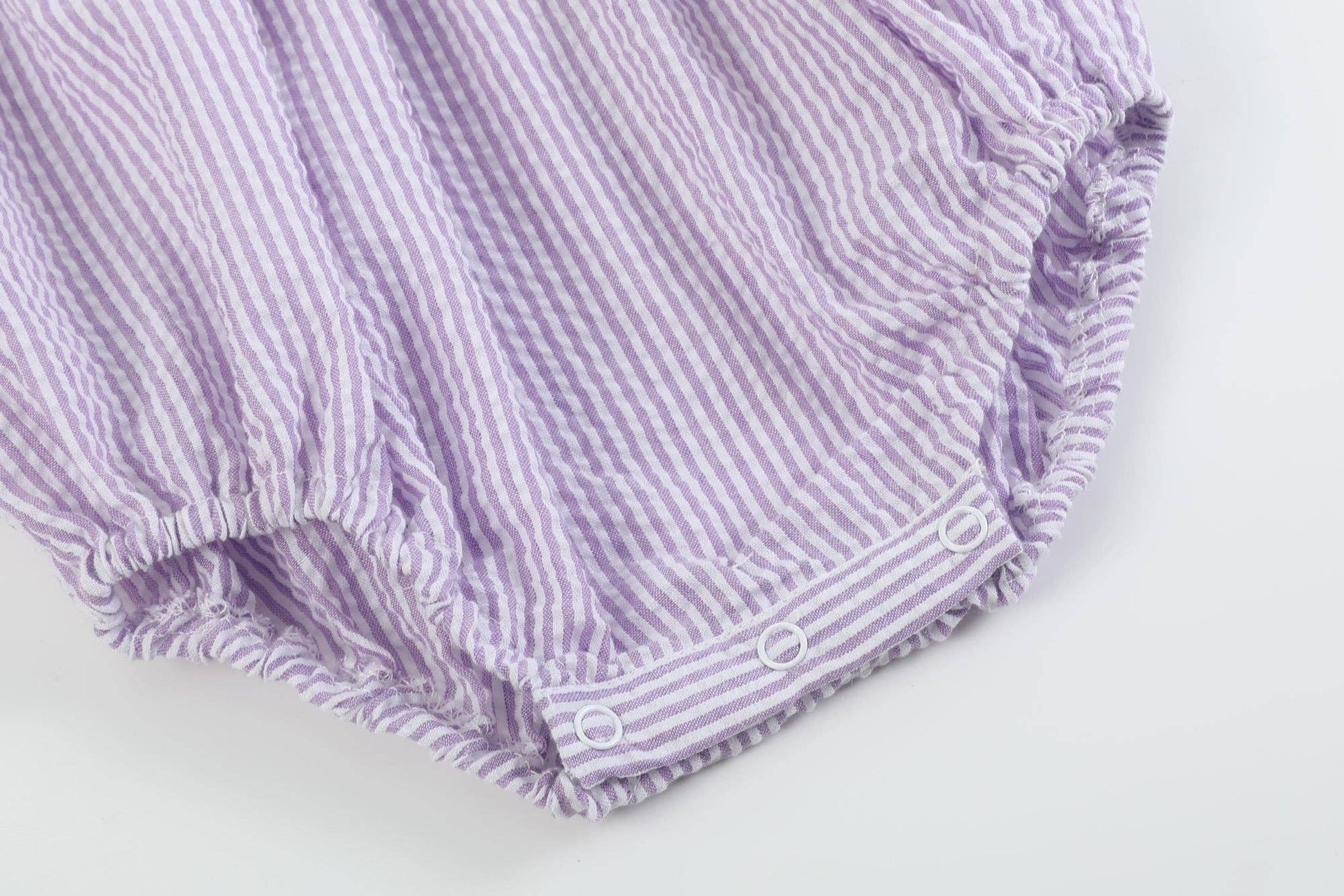 Precious in purple! This Light Purple Seersucker Bunny Smocked Romper is egg-stra special and the perfect look for your sweet girl for you Easter festivities. Featuring a smocked neckline and embroidered bunnies that's as cute as a bunny's nose. While snaps at the crotch ensure quick and easy diaper changes. Your little bunny will be the hoppiest in town wearing this romp-tastic outfit.